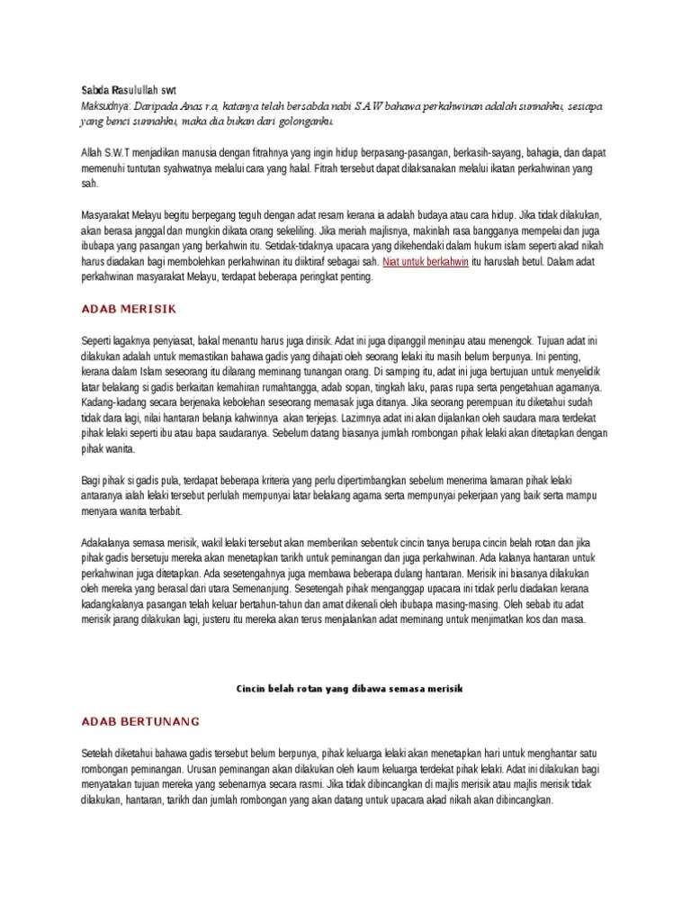 Hukum adat, menjelaskan cara meminang suku serawai dalam perspektif hukum. 2 perempuan dan 1 orang lagi merupakan pimpinan rombongan) . Ilustrasi dan isi kandungan buku ini dalam apa jua bentuk dan dengan cara apa jua. Tata cara melamar gadis sesuai dengan adat palembang, sumatera selatan. Dalam islam hubungan diatur lewat gerbang yang diaebut nikah yang diawali dengan pinangan atau lamaran, dalam adat melayu jambi pinangan dilakukan oleh pihak .